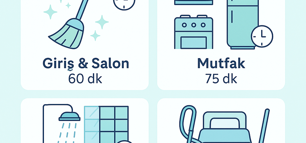 - Giriş & Salon (60 dk): Dağınıklığı topla → toz alma (yüksek yüzeylerden aşağı) → zemin süpür & paspas → camları sil.